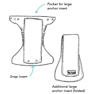 For increased absorbency, fold the large anchor insert in half and place on top or under the snap-in insert as you prefer. The larger end works best pointing towards the back of the nappy, but all inserts can be changed and configured to suit your needs and preference. There is an optional pocket in the back of the shell where boosting can be placed instead of laying inside or adding additional absorbency if needed.