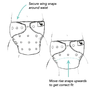 If needed, shorten the front of the nappy to make it trimmer by snapping up the next row of rise snaps. Refer to fitting images above.